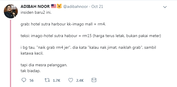 "Insiden baru-baru ini, kadar harga perkhidmatan grab hanya RM 4 dari Sutra Harbour Kota Kinabalu ke Imago Mall.