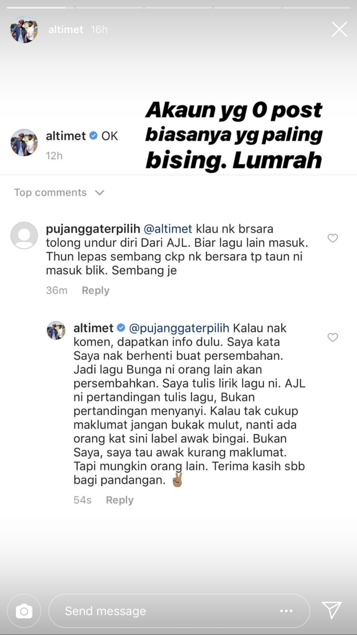 “Altimet kalau nak bersara tolong undur diri dari AJL. Biar lagu lain masuk. Tahun lepas sembang cakap nak bersara tapi tahun ini masuk balik. Sembang je,” tulis pengguna id @pujanggaterpilih.
