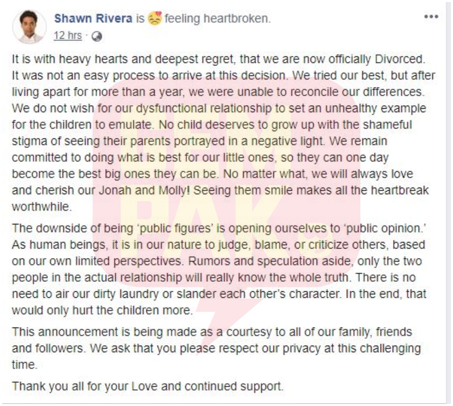 Suami kepada penyanyi Jaclyn Victor, Shawn Rivera mengumumkan sudah bercerai dengan penyanyi tersebut selepas tidak tinggal sebumbung selama lebih satu tahun.