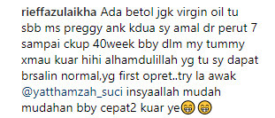 “Selain dari bersenam, berjalan dan amalkan ayat-ayat Suci Al-Quran, ibu juga digalakkan amalkan Virgin Coconut Oil dan makan buah nanas untuk cepatkan bukaan dan lancarkan laluan bersalin. Eh betul ke?
