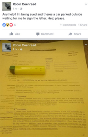 Perkara tersebut telah didedahkan Robin menerusi akaun sosial Facebook (FB)nya, kira-kira pukul 11 malam tadi (Rabu) dengan memuat naik surat saman yang diterimanya daripada Gabriella.