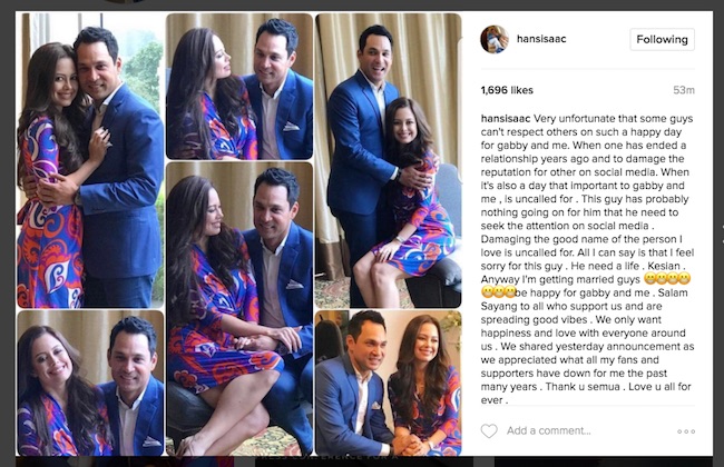 Sementara itu, Hans telah tampil membela bakal isterinya menerusi sebuah kenyataan di Instagram dan FB.