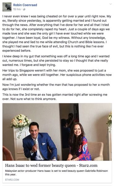 Robin turut meluahkan kekecewaanya sejurus mendapat tahu berita perkahwinan wanita itu bersama Hans semalam, dan mendakwa Gabriella baru sahaja meluangkan masa bersamanya beberapa hari lalu.