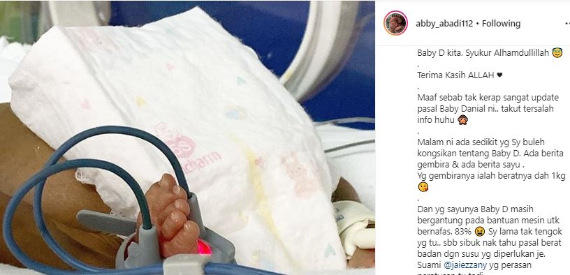 Pelakon Abby Abadi berkongsi perkembangan terbaru mengenai anaknya, Muhammad Danial Firman yang masih menerima rawatan di wad Unit Rawatan Rapi Neonatal (NICU).