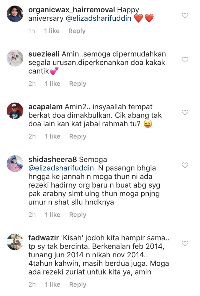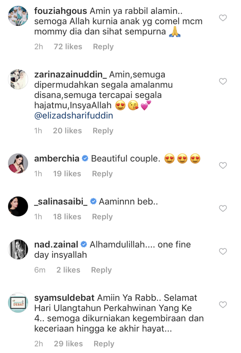 Menerusi ruangan komen, rata-rata rakan artis dan peminat turut menyampaikan ucapan ulang tahun perkahwinan serta mendoakan pasangan itu dikurniakan cahaya mata.