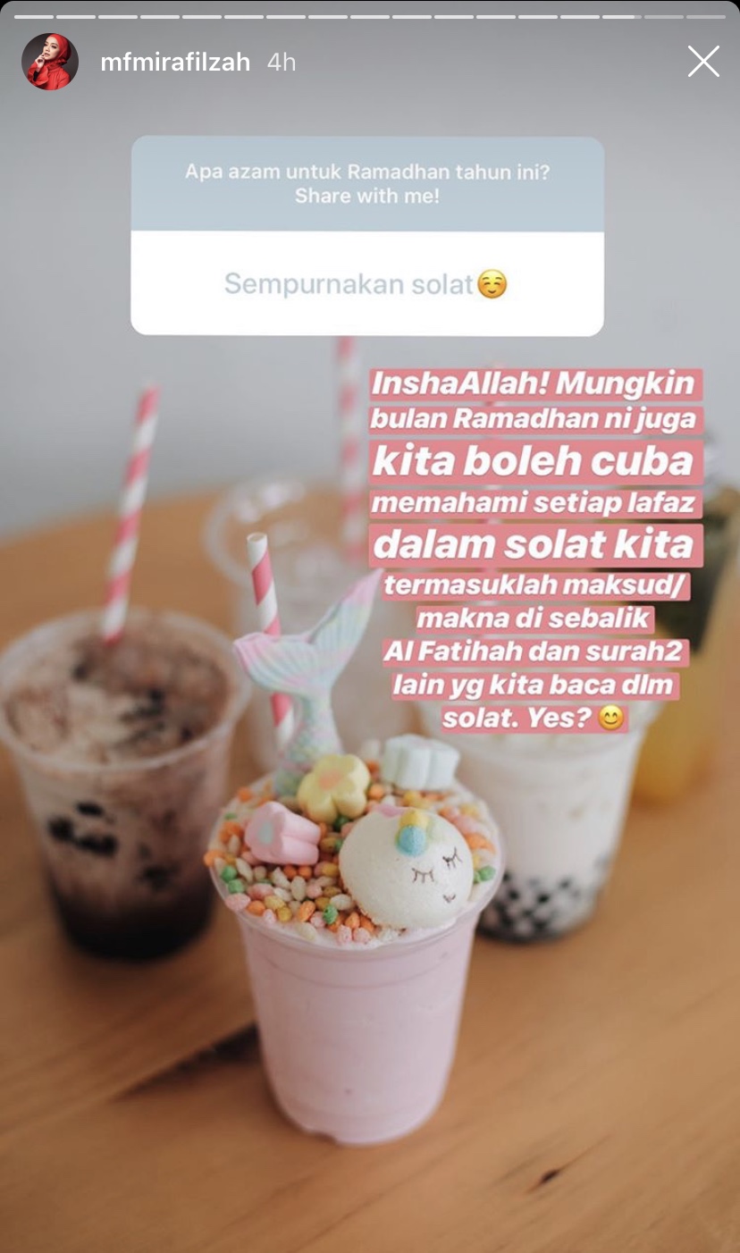 "InshaAllah! Mungkin bulan Ramadan ni juga kita boleh cuba memahami setiap lafaz dalam solat kita termasuklah maksud/makna di sebalik Al Fatihah dan surah-surah lain yang kita baca dalam solat. Yes?" tulisnya lagi.