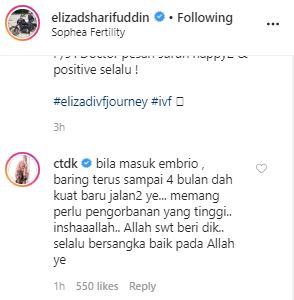 “Bila masuk embrio, baring terus sampai 4 bulan dah kuat baru jalan-jalan ya... Memang perlu pengorbanan yang tinggi… Insya-Allah… Allah SWT beri dik… Selalu bersangka baik pada Allah ya,” tulisnya.