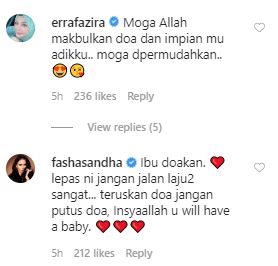 “Ibu doakan. Lepas ni jangan jalan laju-laju sangat... Teruskan doa jangan putus doa. Insya-Allah you will have a baby,” doa @fashasandha.