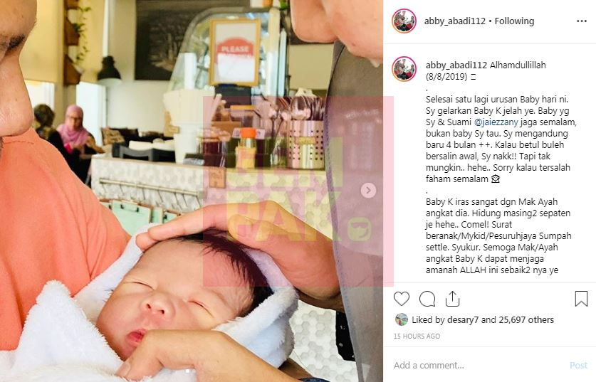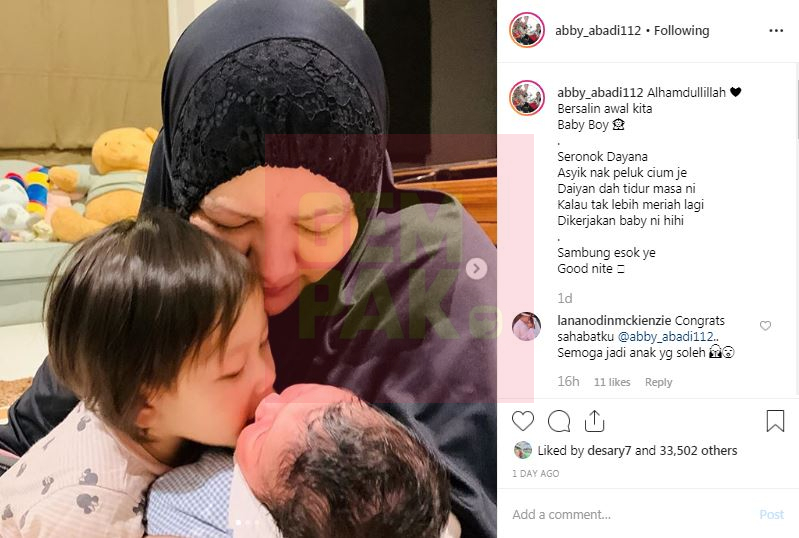 Kelmarin, Abby mencetuskan spekulasi bahawa dia kini sudah bersalin apabila memuat naik sekeping foto mendukung seorang bayi lelaki.