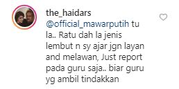 “@official_mawarputih Tu lah… Ratu dah lah jenis lembut dan saya ajar jangan layan dan melawan, hanya report pada guru sahaja, biar guru yang ambil tindakan,” tulisnya.