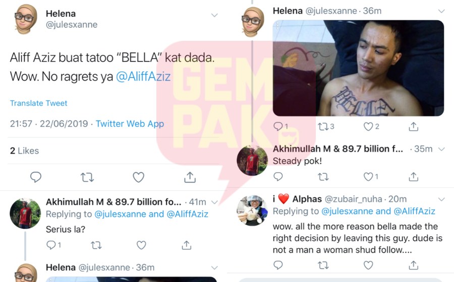 Seorang pengguna Twitter dengan nama @julesxanne memuat naik foto seorang lelaki mirip Aliff tertera tatu di dada dengan nama Bella.