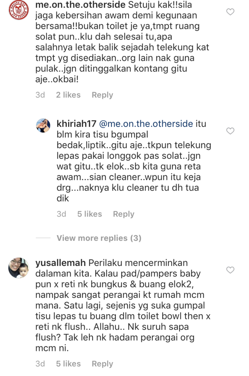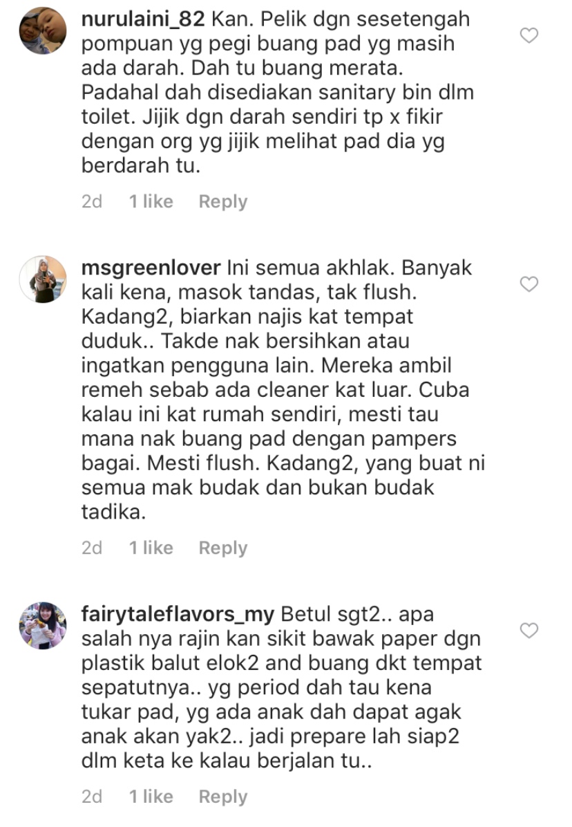 "Korang andai rasa tanggungjawab, kita takkan buang tuala wanita @ pad, pampes bersepah macam tu je dengan taik, darah masih melekat.