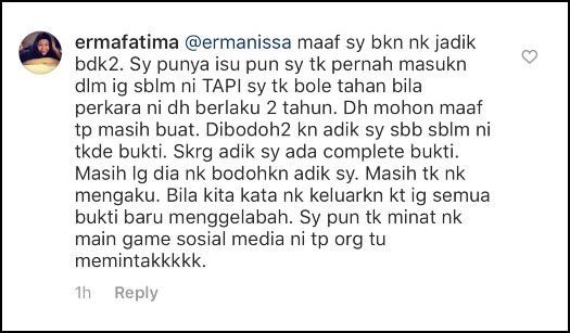 Dalam pada itu menjawab komen pengguna warga net yang lain, Erma menegaskan dia bukan bersikap kebudak-budakan, tetapi tidak boleh berdiam lagi kerana perkara yang berlaku kepada Umie sudah berlarutan dua tahun.