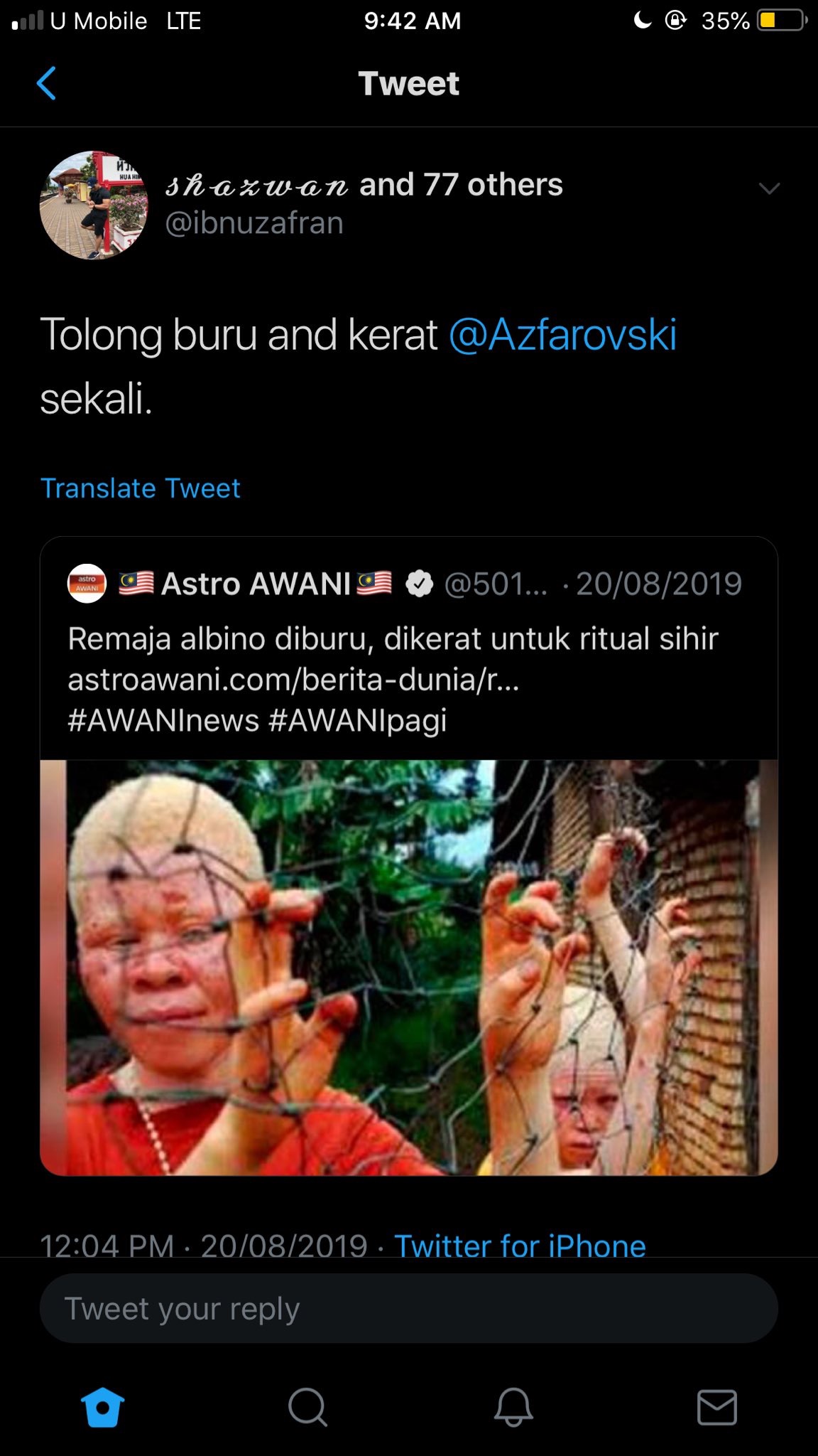 Secara kebetulan, Shazwan adalah individu yang memuat naik tweet itu dan dia telah mengaitkan diri Azfar dengan sebuah artikel mengenai golongan albino yang dikerat untuk ritual sihir.