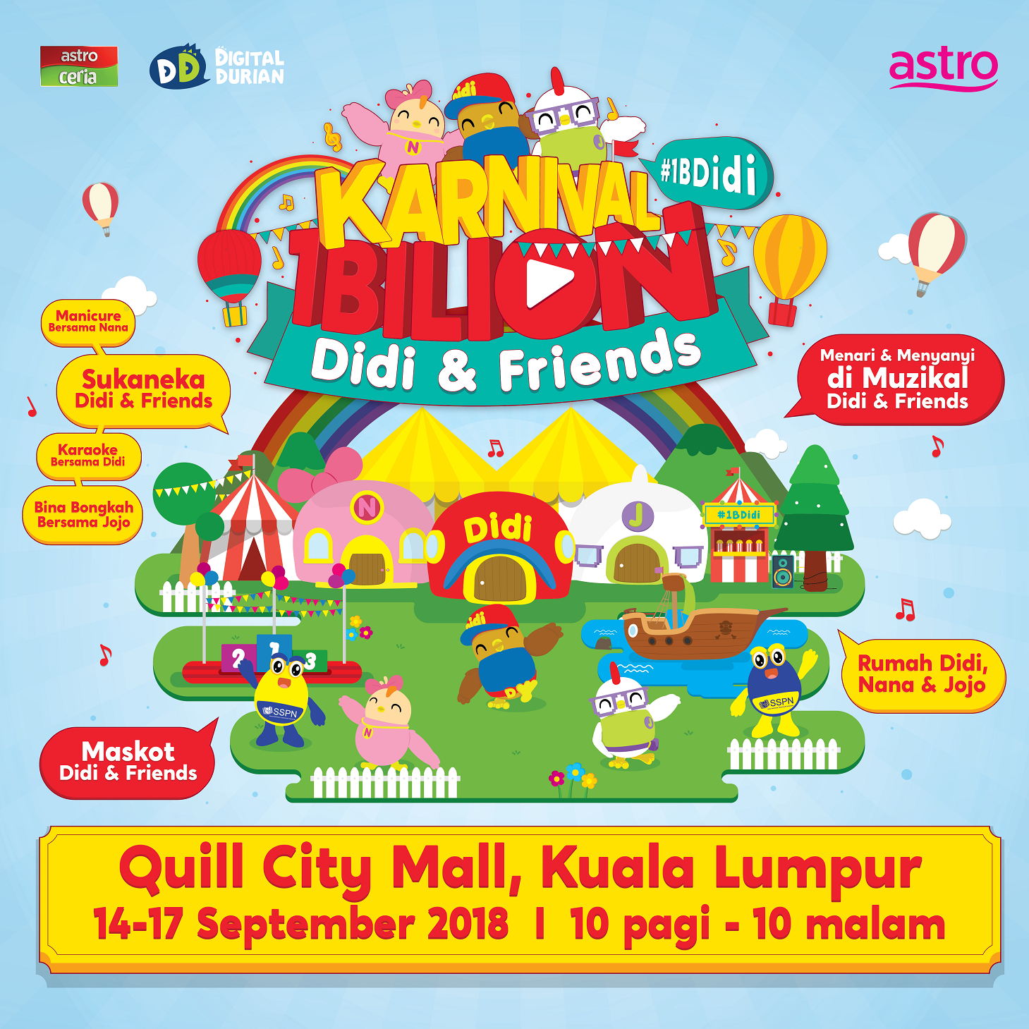 Jangan lupa temu janji anda bersama Didi, Nana dan Jojo di ‘Karnival 1 Bilion Didi & Friends’ pada 14 hingga 17 September ini bertempat di Quill City Mall, Kuala Lumpur. Jumpa anda di sana!