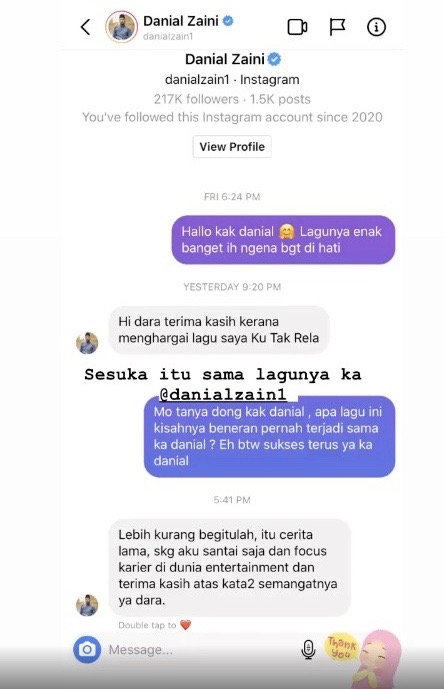 Lebih menguatkan spekulasi, Dara menerusi laman IG turut berkongsi tangkap layar (screenshot) perbualan mereka yang ‘meleret’ hingga ke Direct Message (DM).