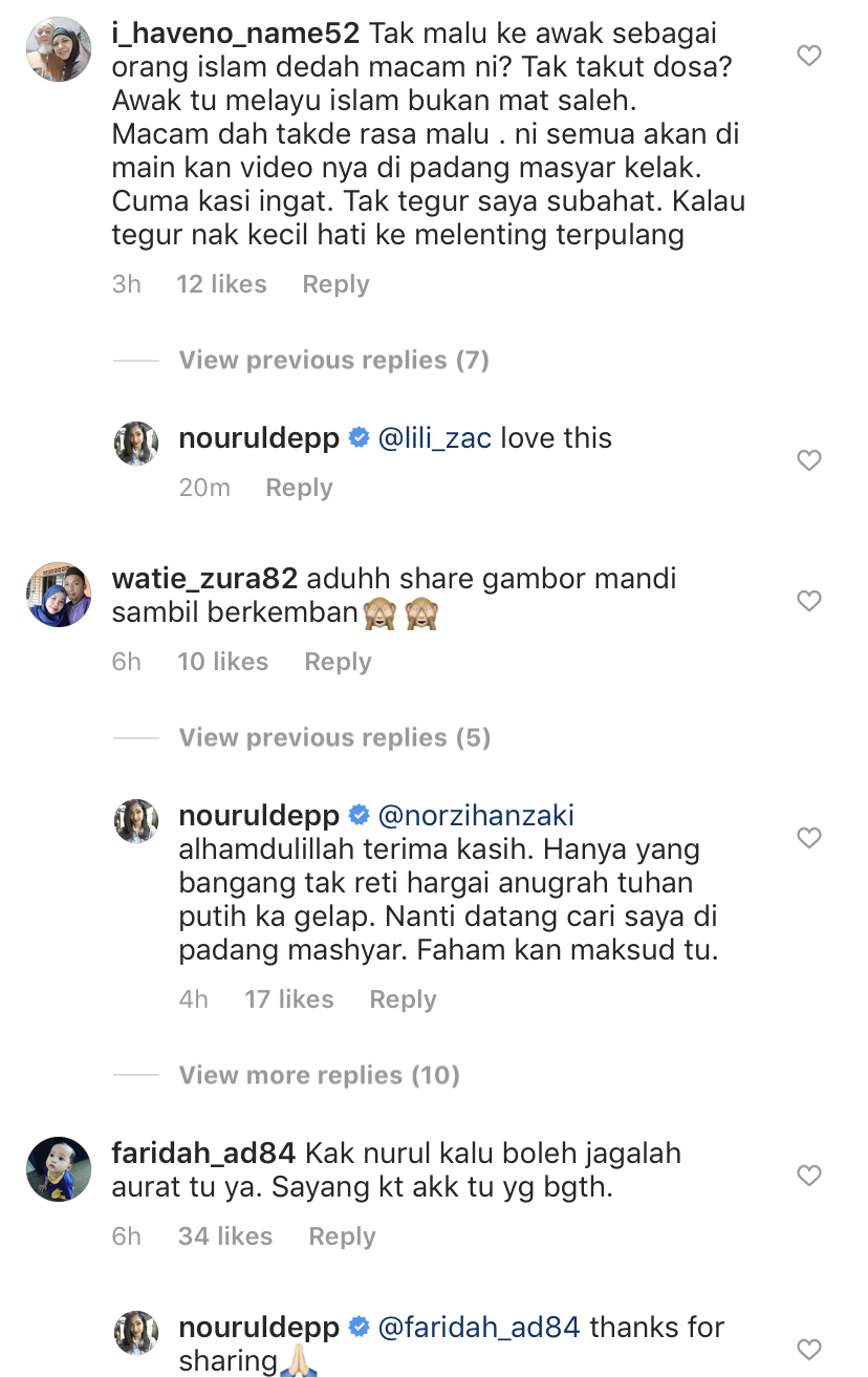 Perkongsian yang dibuat bagi meraikan hari terakhir Nourul berpantang itu mendapat pelbagai kritikan dan komen negatif daripada netizen yang dianggap kurang enak untuk dipaparkan kepada khalayak umum.
