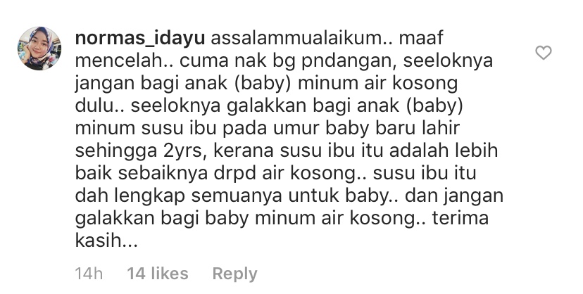 "Susu ibu itu dah lengkap semuanya untuk baby.. Dan jangan galakkan bagi baby minum air kosong. Terima kasih," tulis netizen itu.