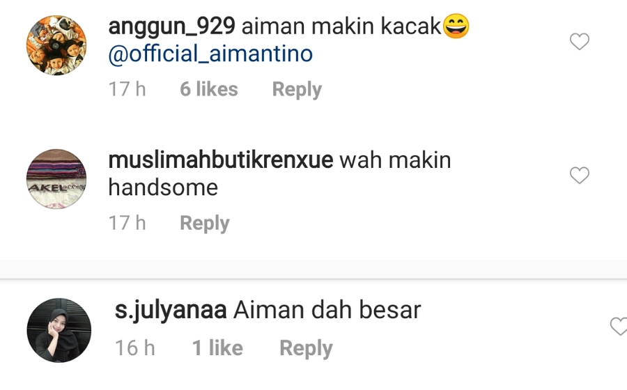 Malah, posting gambar terbaru Aiman di laman Instagram dibanjiri dengan pujian yang mengatakan penyanyi muda itu semakin kacak.