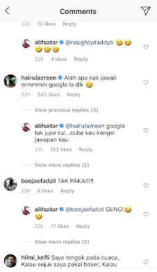 Menjengah ruangan komen, rata-rata pengikut Alif dan beberapa rakan artis meninggalkan respon berunsur jenaka.