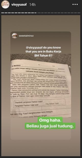 “@vivyyusof do you know that you are in buku kerja BM tahun 6?” tulis pengikutnya yang menggunakan id @sweetalmiraz.