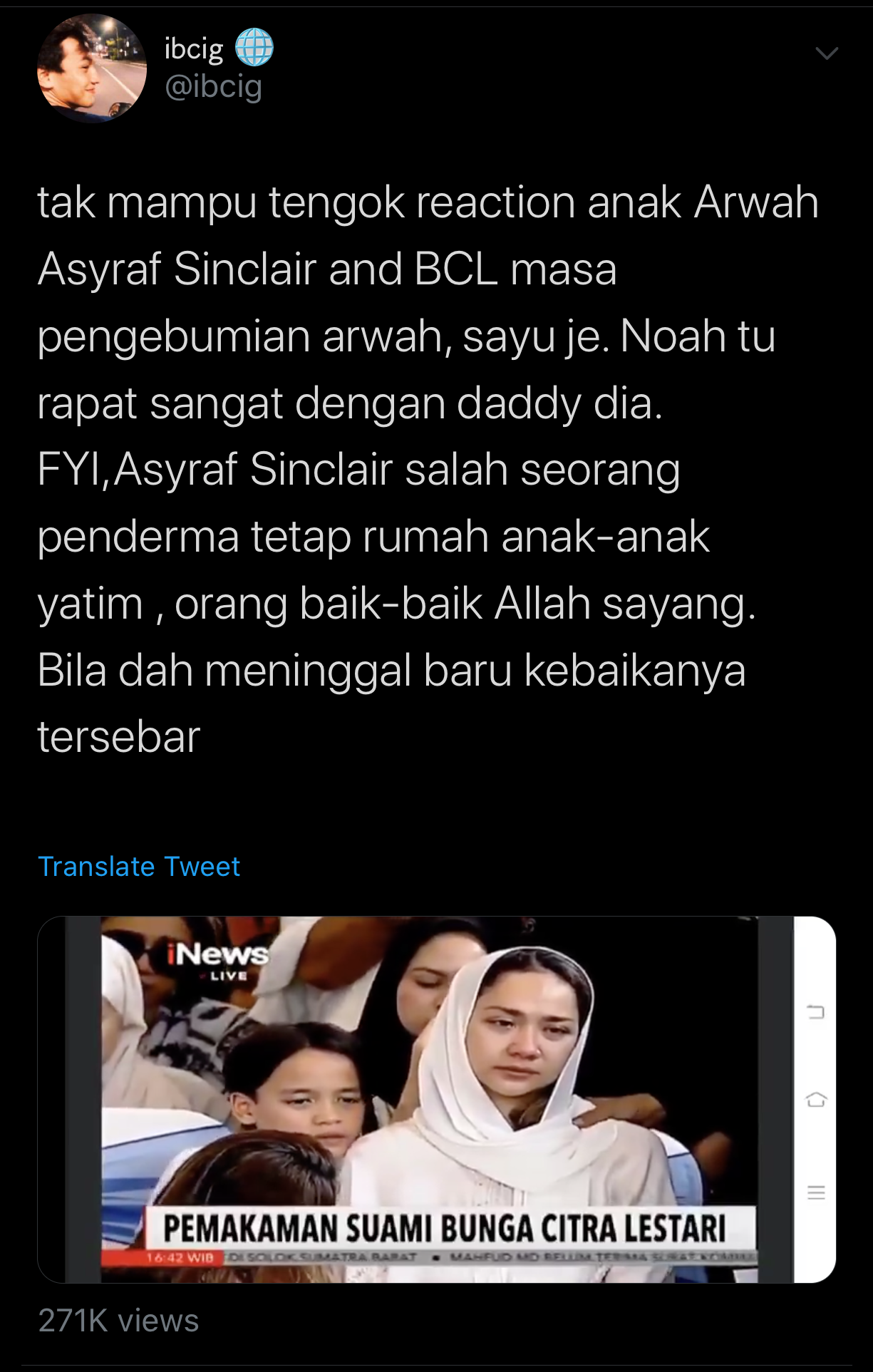 Luluh hati netizen apabila melihat video yang memaparkan momen anak tunggal penyanyi Bunga Citra Lestari, Noah Aidan Sinclair sewaktu menghadiri majlis pengebumian bapanya, arwah Ashraf Sinclair.