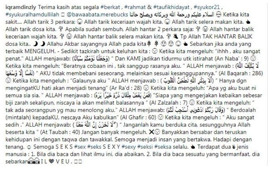Menerusi foto tesebut Iqram telah menulis kasyen menarik berunsur peringatan dan nasihat, namun perkara tersebut tidak disenangi netizen.