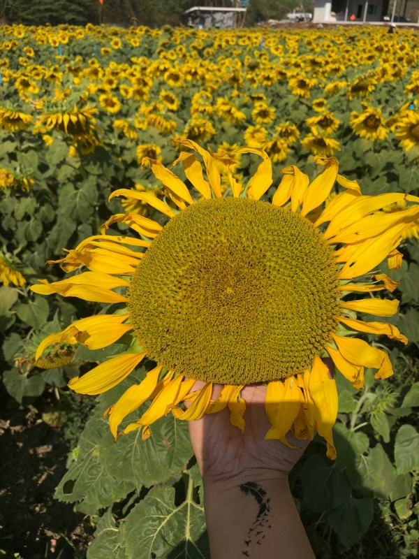 Cantik! Saya tergamam seketika kerana tidak pernah melihat bunga matahari sedekat dan sebanyak ini. Ada sebesar muka dan ada juga yang kecil comel. Awas ketika lalu di celah-celah bunga matahari ini kerana ada sarang semut api yang bakal anda pijak.