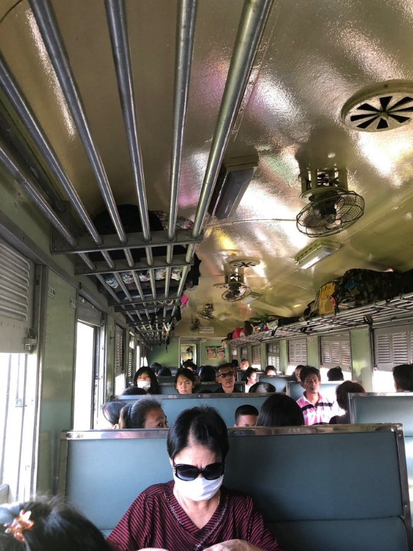 Kereta api tiba, saya ingatkan tak ramai orang tapi rupanya penuh! Saya dan teman berdiri hampir satu jam dan apabila kereta api berhenti di stesen Rangsit, ada ramai turun dan akhirnya kami boleh duduk sehingga Bangkok.