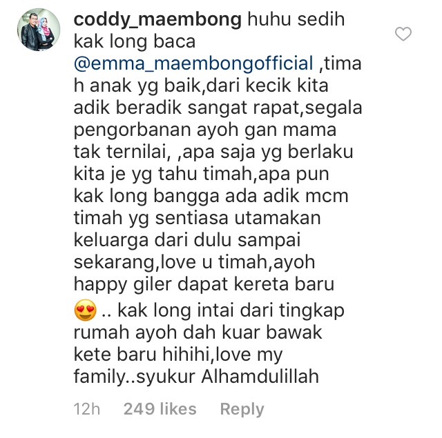 "Byk cabaran dan dugaan tp apa2 pon yg jadi usaha paling penting. And This is for you ayoh. Thank you sbb jaga tima dgn baik. Dari kecik sampai besar. Tima cuma nak ayah dan mama bangga dgn tima. Hope you like. Love you so much ayoh. I got my cool sport car from @dtcmotors. Thank you!" tulis Emma diruangan kapsyen.