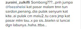 “Eh lupa nak update, Faezah Elai datang kedai siang tadi. Tapi disebabkan muka dia tak make up dan dia sombong gila so tak adalah kitorang ambil gambar dengan dia,” tulisnya.