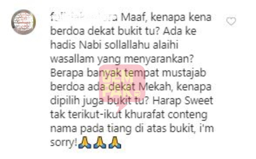 “Maaf, kenapa kena berdoa dekat bukit tu? Ada ke hadis Nabi Sollallahu Alaihi Wasallam yang menyarankan? Berapa banyak tempat mustajab berdoa ada dekat Makkah, kenapa dipilih juga bukit tu? Harap Sweet tak terikut-ikut khurafat conteng nama pada tiang di atas bukit, maafkan saya,” tulis individu tersebut.