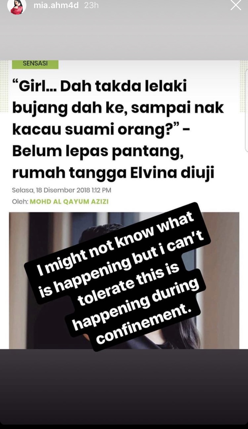 "I might not know what is happening but I can't tolerate this is happening during confinement," tulis Mia menerusi Instagram Stories miliknya.