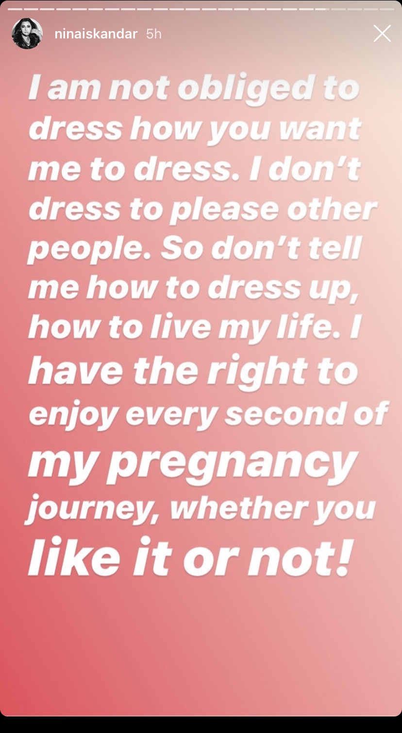"Jadi jangan beritahu saya cara berpakaian, cara hidup saya. Saya berhak menikmati setiap saat perjalanan kehamilan, sama ada anda suka atau tidak," tulisnya.