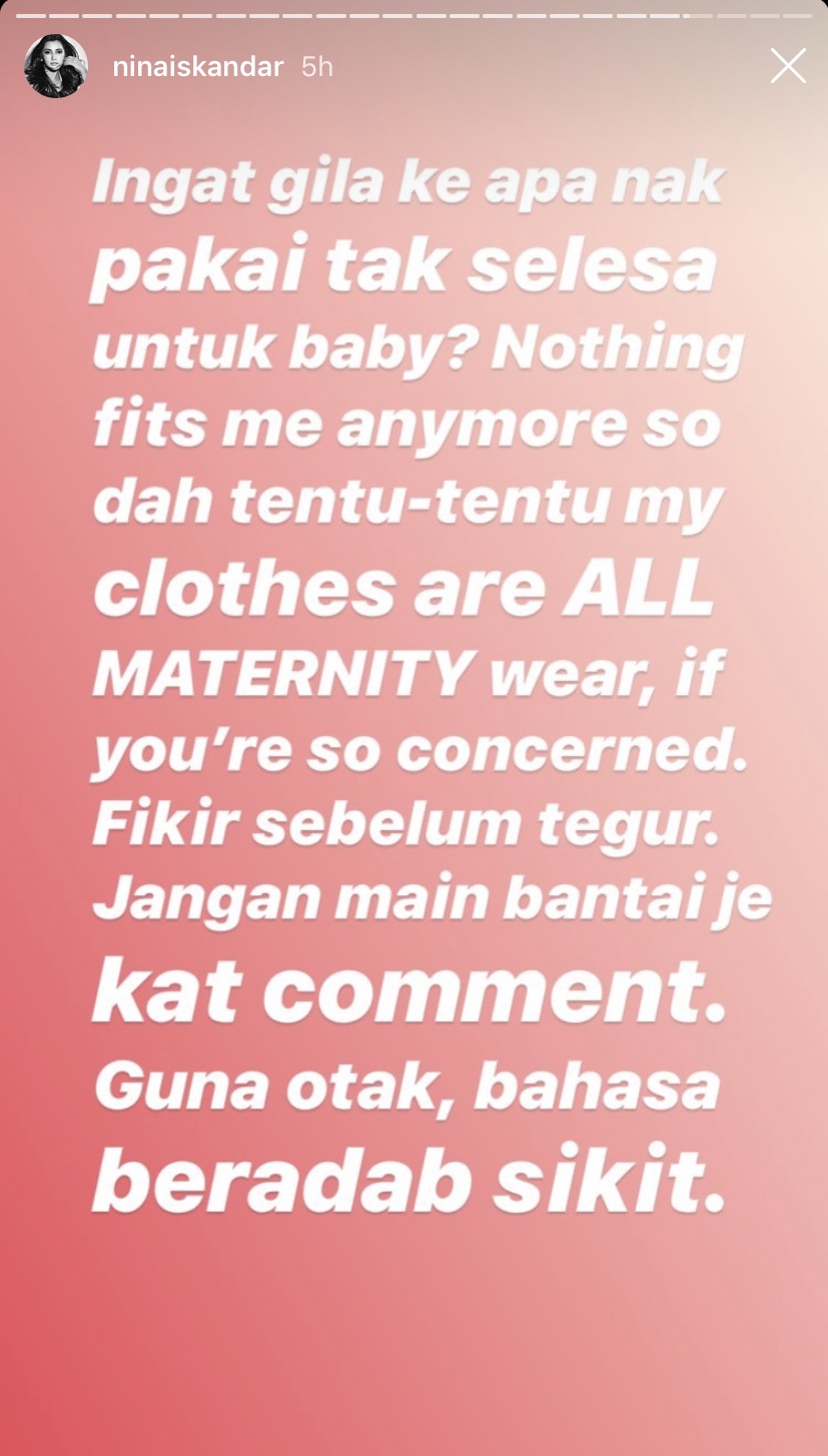 Isu ini timbul apabila Nina mendapat kecaman daripada pengikutnya kerana beranggapan pakaian yang digayakan itu terlampau ketat serta tidak sesuai untuk ibu hamil.