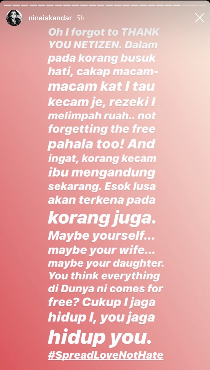 Dalam pada itu, Nina turut mengingatkan kepada semua pihak untuk fikir terlebih dahulu serta tidak menghentam sesuka hati.