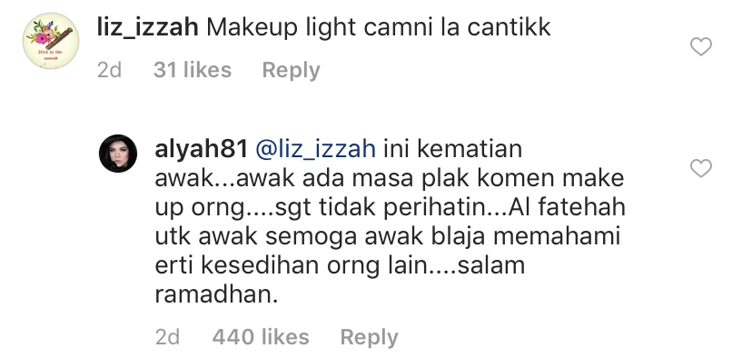 Menurut Alyah individu tersebut lebih prihatin tentang solekannya daripada tujuan entri tersebut.