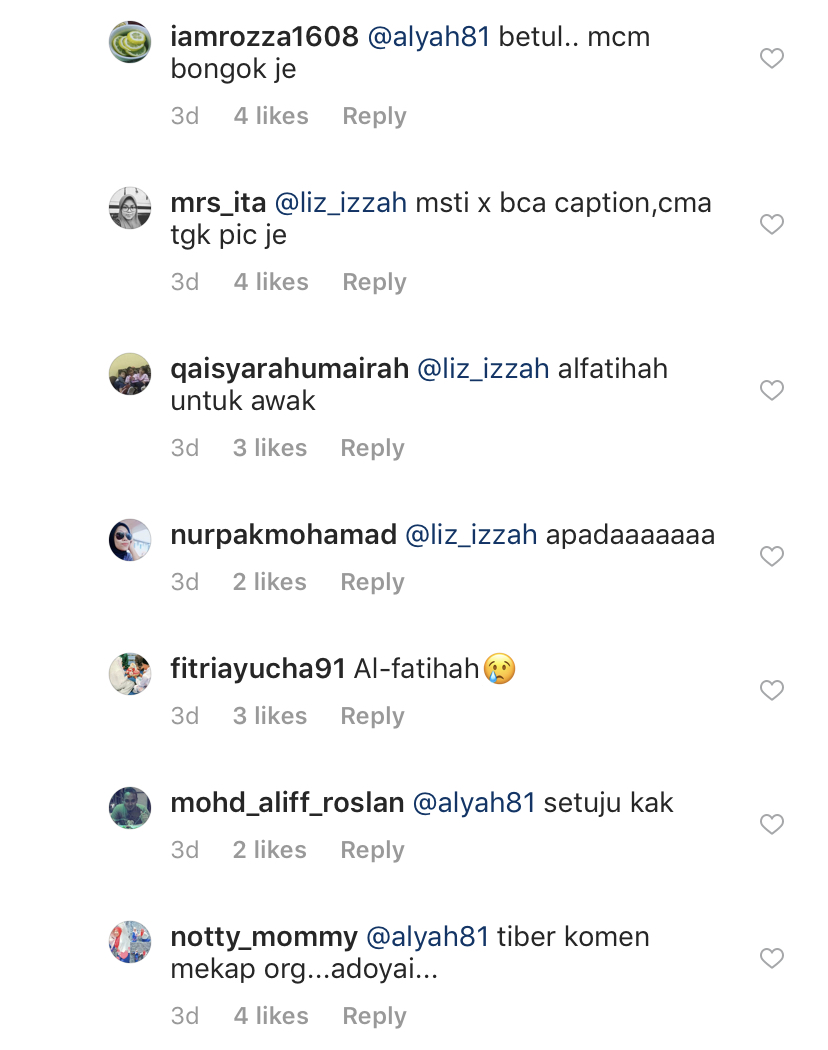 Rata-rata pengikut Alyah turut sama tidak berpuas hati serta beranggapan individu tersebut tidak mambaca kapsyen yang ditulis.