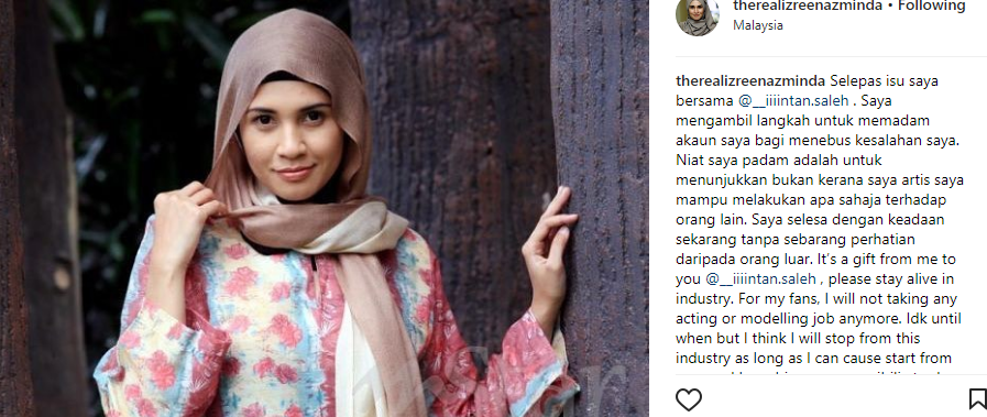 "Saya akan aktifkan semula akaun IG itu pada masa yang saya rasakan sesuai nanti. Buat masa ini, saya selesa memilih untuk menutupnya," katanya seperti yang dilapor BH Online.