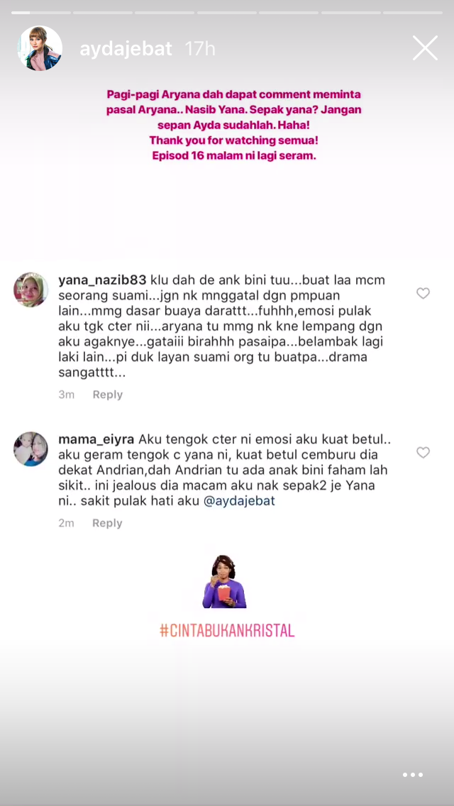 Pun begitu, Ayda membalas komen-komen kecaman netizen serta mengucapkan terima kasih kerana menonton drama bersiri tersebut.
