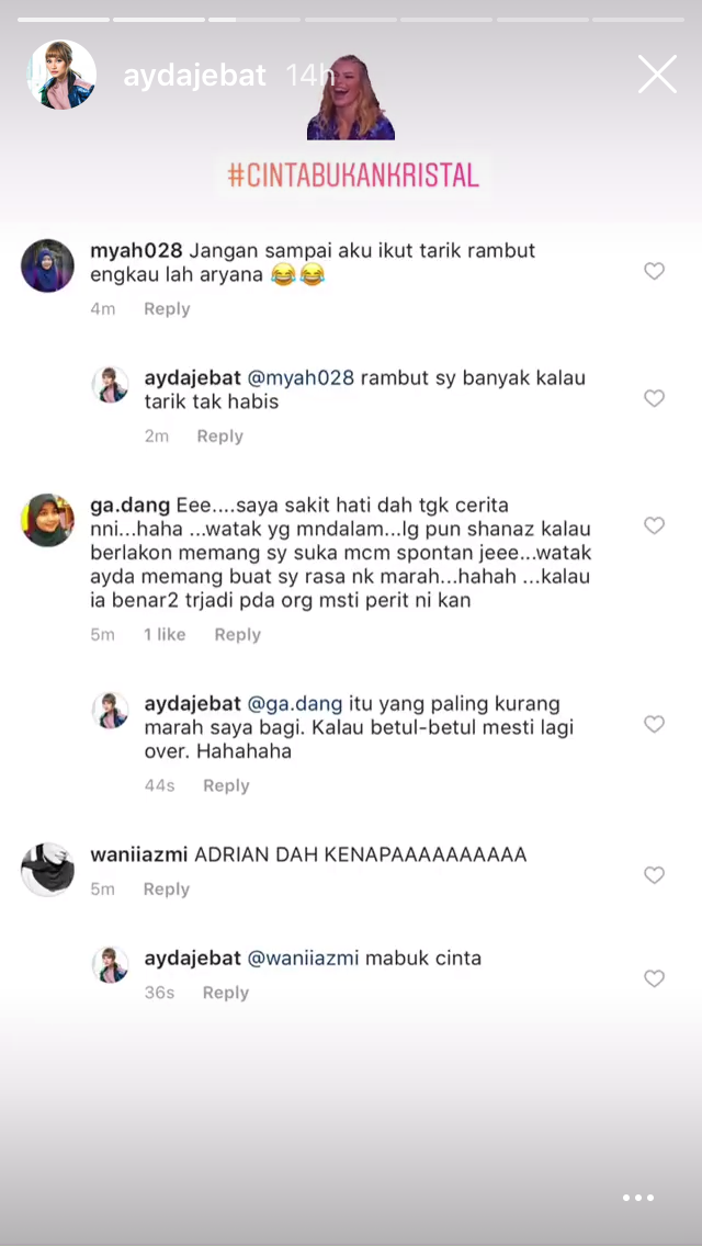 Pelakon dan penyanyi, Ayda Jebat, 26, berkongsi pelbagai respon berbaur kecaman mengenai sebuah karakter yang dilakonkan olehnya menerusi ruangan Instagram Stories.