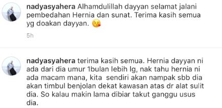 “Alhamdulillah, Dayyan selamat menjalani pembedahan Hernia dan sunat. Terima kasih semua yang doakan Dayyan,” tulisnya.