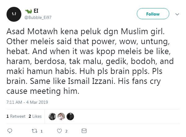 "Asad Motawh kena peluk dgn Muslim girl. Other meleis said that power, wow, untung, hebat. And when it was kpop meleis be like, haram, berdosa, tak malu, gedik, bodoh, and maki hamun habis.