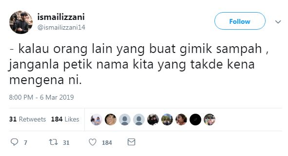 "Kalau orang lain yang buat gimik sampah, janganlah petik nama kita yang takde kena mengena ni," tulisnya yang dipercayai pemegang akaun Twitter @ismailizzani14 semalam.