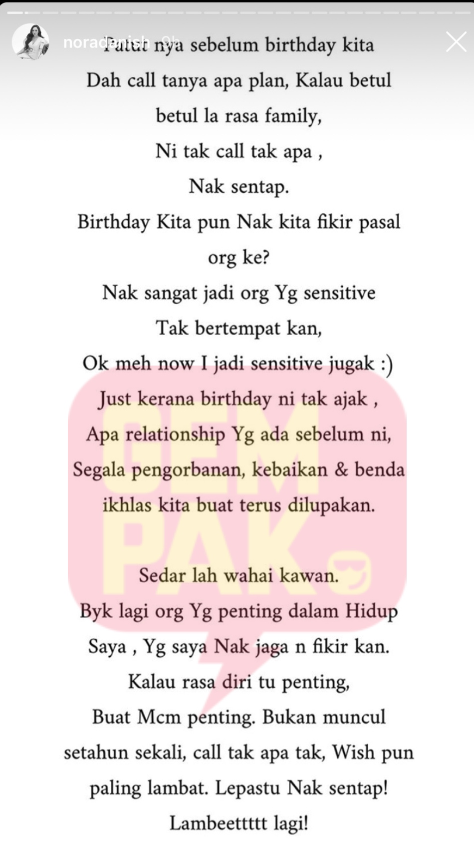 "Kalau rasa diri itu penting, buat macam penting. Bukan muncul setahun sekali, call tak apa tak, wish pun paling lambat.