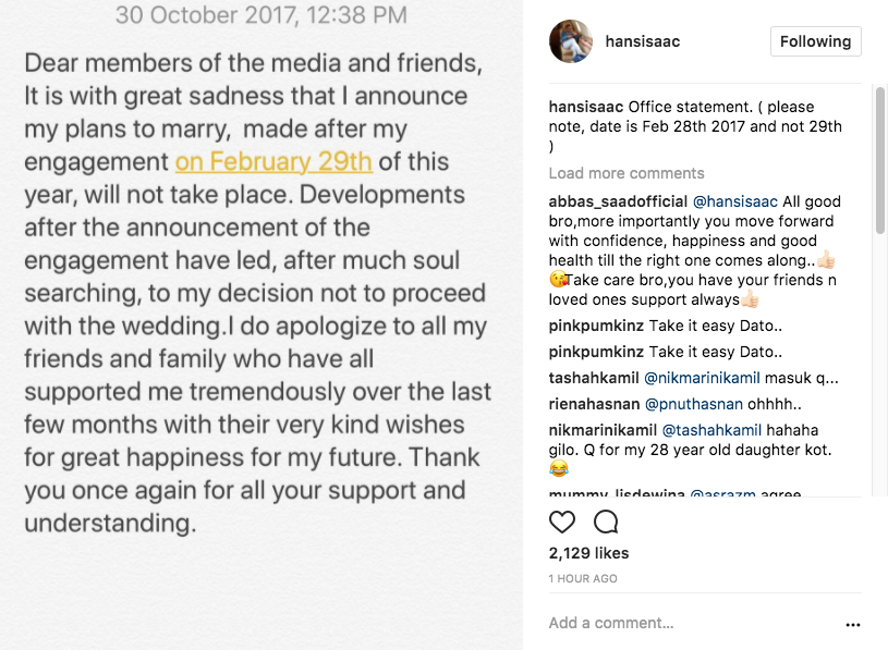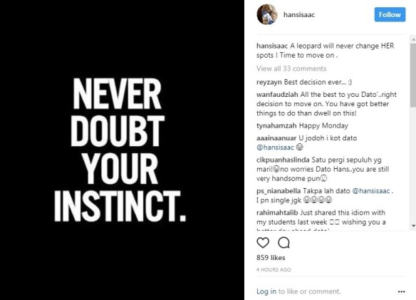 Sementara itu menerusi laman Instagram Hans, penerbit filem Lemak Kampung Santan itu turut memuat naik status peribahasa dalam Bahasa Inggeris iaitu Never Doubt Your Instinct (jangan ragui naluri anda) bersama kapsyen A leopard will never change HER spots ! Time to move on (Harimau Bintang tidak akan bertukar bintiknya! Masa untuk teruskan hidup).