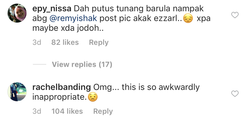 "@epy_nissa: Dah putus tunang barula nampak abg @remyishak post pic kak ezzarl. Takpa maybe takda jodoh."