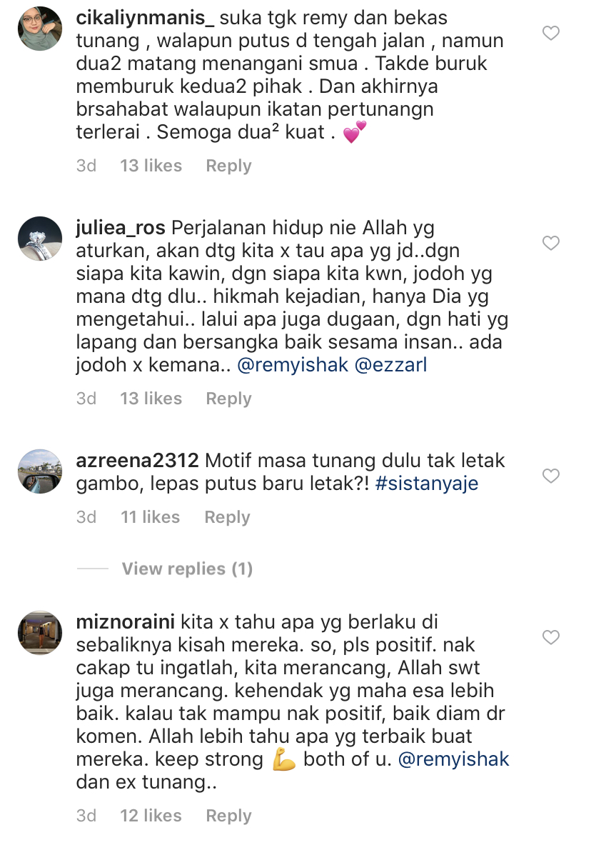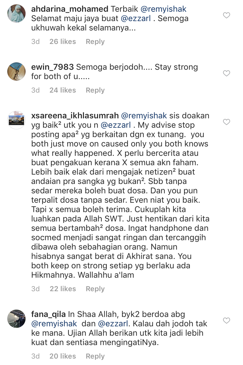 Ada peminat mendoakan semoga suatu hari nanti Remy dan Ezza kembali bersama serta berharap agar mereka tabah menghadapi dugaan hidup.
