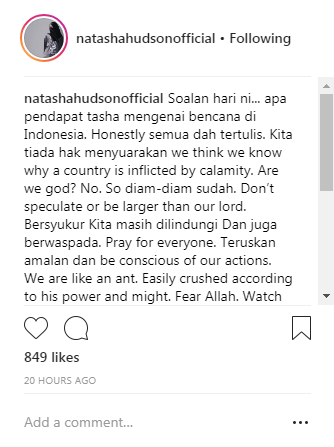 Pelakon popular, Natasha Hudson meluahkan rasa terkilan terhadap segelintir pihak yang membuat spekulasi negatif mengenai punca kejadian gempa bumi dan tsunami yang melanda Sulawesi Tengah, Indonesia beberapa hari lalu.