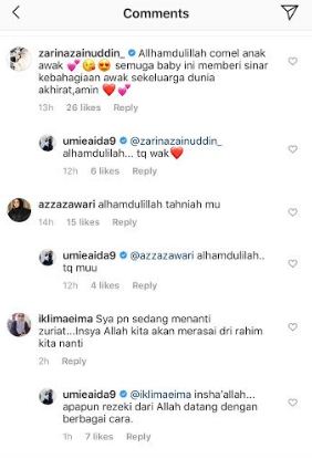 Menjengah ruangan komen, rata-rata pengikut Umie mengucapkan tahniah dan tumpang gembira dan mendoakan bayi itu menjadi seorang anak yang solehah.